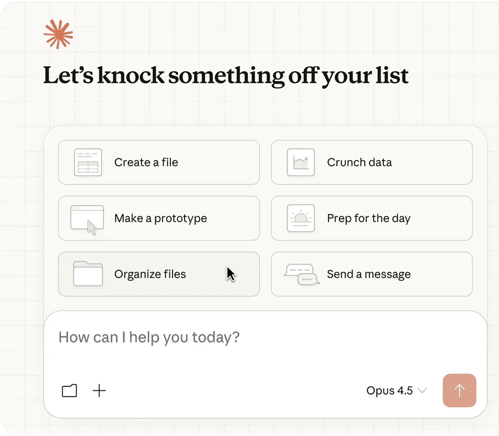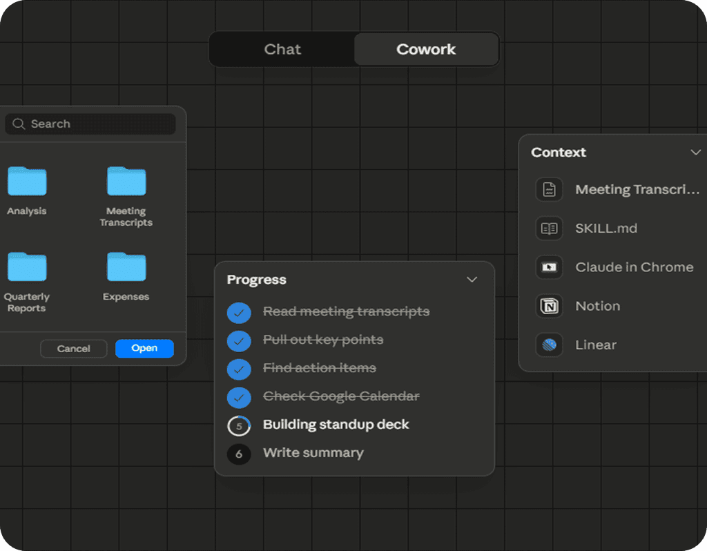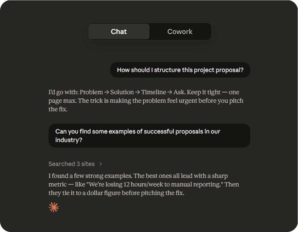 Find Cowork in your desktop app, alongside Chat and Code. Switch to